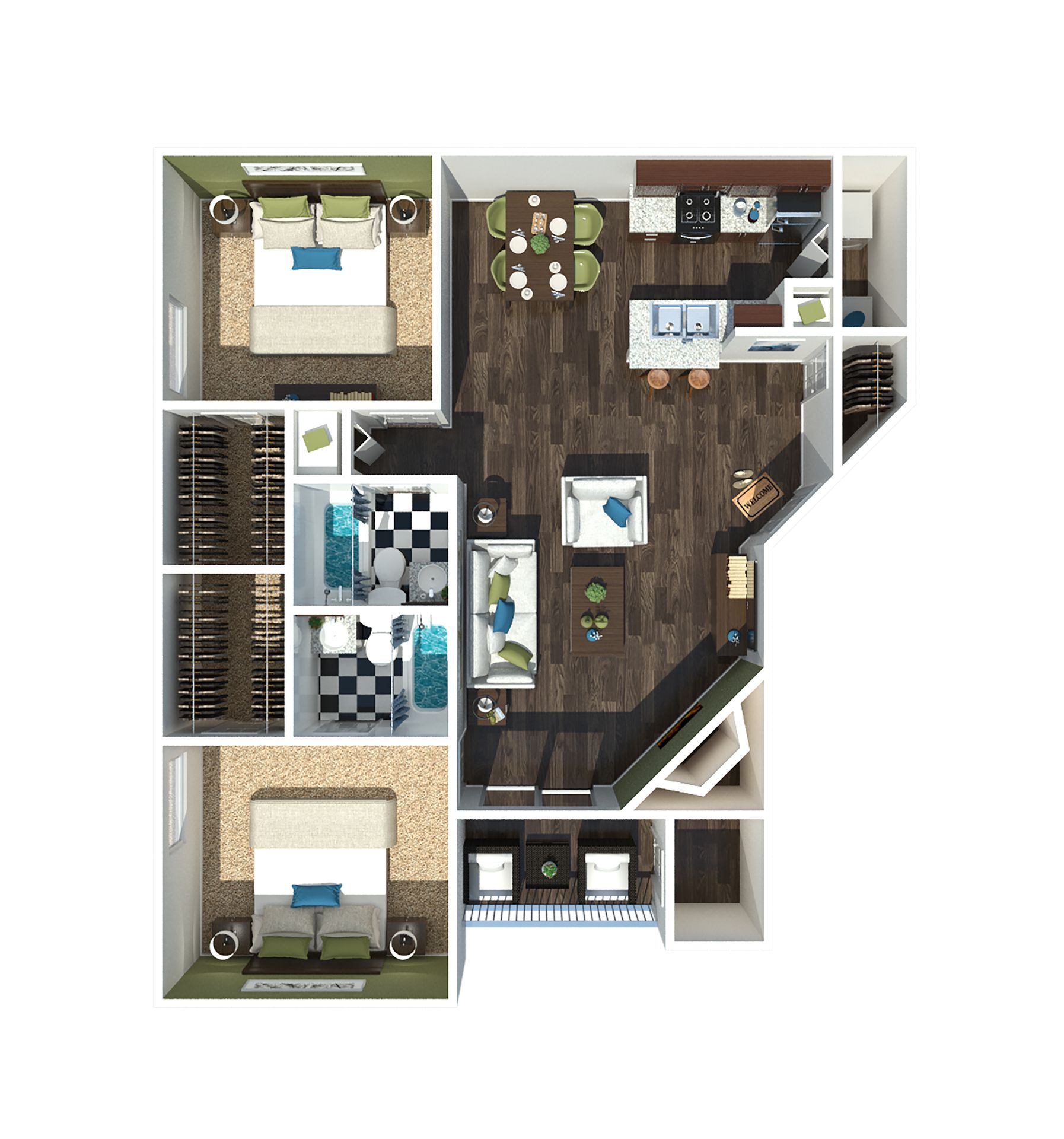 Comfortable stylish two-bedroom two-bathroom apartments. Plenty of room for a king-size bed. Washer and dryer connections. Fireplaces are available in second and third floor apartments. Spacious balcony or patio with storage closet.